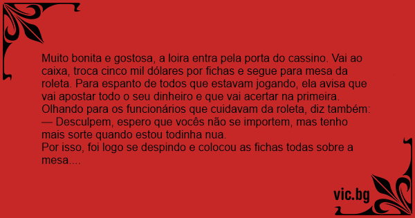 Por isso, foi logo se despindo e colocou as fichas todas sobre a mesa. Completamente assustado, o croupier girou a roleta. Enquanto a bolinha rolava pelos números, a loura, rebolando nua em frente a mesa, dizia em voz alta sem parar: