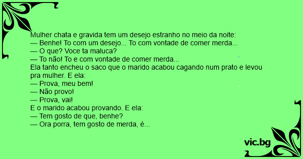 Ela tanto encheu o saco que o marido acabou cagando num prato e levou pra mulher. E ela: