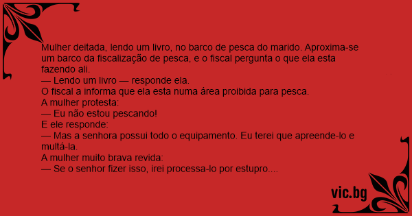 Mulher deitada, lendo um livro, no barco de pesca do marido. Aproxima-se um barco da fiscalização de pesca, e o fiscal pergunta o que ela esta fazendo ali.