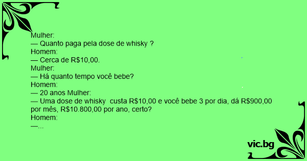 — Uma dose de whisky custa R$10,00 e você bebe 3 por dia, dá R$900,00 por mês, R$10.800,00 por ano, certo?