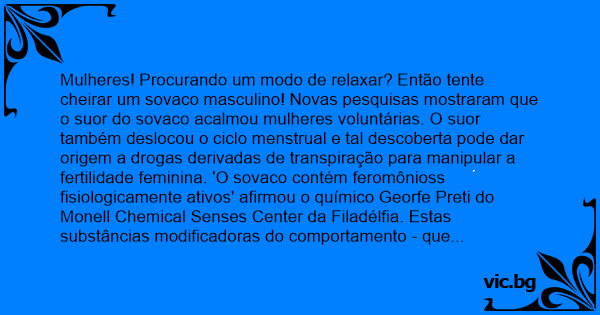 Mulheres! Procurando um modo de relaxar? Então tente cheirar um sovaco masculino! Novas pesquisas mostraram que o suor do sovaco acalmou mulheres voluntárias. O suor também deslocou o ciclo menstrual e tal descoberta pode dar origem a drogas derivadas de transpiração para manipular a fertilidade feminina. 'O sovaco contém feromônioss fisiologicamente ativos' afirmou o químico Georfe Preti do Monell Chemical Senses Center da Filadélfia. Estas substâncias modificadoras do comportamento - que são comuns no mundo animal - podem influenciar o cérebro e portanto nossos corpos sem que percebamos. Por seis horas as mulheres voluntárias foram expostas a feromônios concentrados de sovacos viris - cuidadosamente mascarados por fragâncias. Os níveis de hormônio luteinizante, uma chave para o ciclo mestrual, foram monitorados. A exposição ao odor masculino acelerou a chegada do próximo ´rush´ de hormônios, é o que afirma o grupo de pesquisa de Georfe Preti. As voluntárias também disseram sentir-se menos tensas e mais relaxadas enquanto cheiravam o suor. Ambos efeitos podem ser uma regressão ao impulso primitivo, sugere Preti. Homens e mulheres das cavernas caçadores-coletores muito ocupados deveriam ter pouco tempo para aproveitar a compania um do outro. O sistema reprodutor da mulher das cavernas pode ter evoluído para estar pronta para seu amado, deslocando os níveis hormonais em resposta a seu cheiro, concorda o pesquisador de feromônios Charles Wysocki, também do centro Monell. 'Mulheres podem responder a sinais ambientais para aumentar o sucesso da reprodução', afirma ele. Mas tudo isso é bastante especulativo, mas a observação do relaxamento das mulheres submetidas ao odor podem também aumentar as chances de reprodução. Uma mulher relaxada é mais facilmente receptiva ao homem, sugere Wysocki. 'Isto apresenta uma dicotomia', diz Ivanka Savic do Karolinska Institute em Estocolmo, que estuda o efeito dos feromônios no cérebro. Um visível lívre arbítrio dos encontros modernos pode estar comprometido pelas nossas necessidades ancestrais. 'Nossa biologia é primitiva mas estamos vivendo em um mundo sofisticado', afirma ela. As descobertas podem ser boas notícias para casais querendo maximizar suas chances de concepção. Uma vez que os feromônios ativos sejam identificados e isolados os pesquisadores podem estar aptos a modificar a produzir uma nova geração de drogas potentes para fertilidade, especula Preti. Nas pesquisas para novas drogas, 'pessoas tem procurado em florestas e nos mares,' diz ele. 'Mas algumas substâncias químicas fisiologicamente ativas podem estar bem em baixo do braço.'.