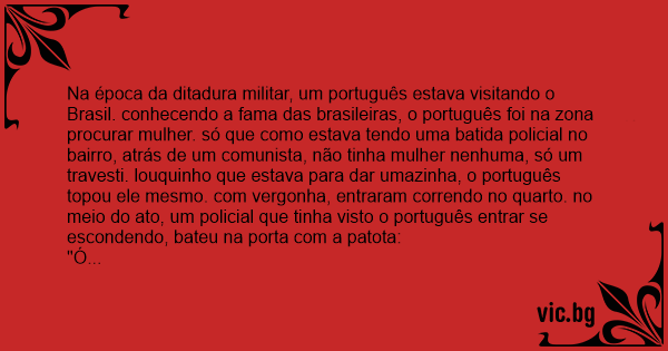 Na época da ditadura militar, um português estava visitando o Brasil. conhecendo a fama das brasileiras, o português foi na zona procurar mulher. só que como estava tendo uma batida policial no bairro, atrás de um comunista, não tinha mulher nenhuma, só um travesti. louquinho que estava para dar umazinha, o português topou ele mesmo. com vergonha, entraram correndo no quarto. no meio do ato, um policial que tinha visto o português entrar se escondendo, bateu na porta com a patota: