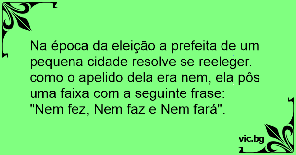 Na época da eleição a prefeita de um pequena cidade resolve se reeleger. como o apelido dela era nem, ela pôs uma faixa com a seguinte frase: