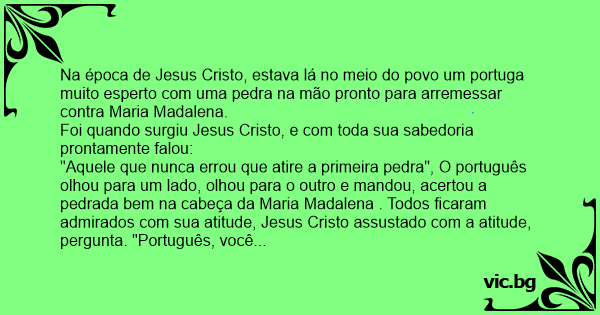 "Aquele que nunca errou que atire a primeira pedra", O português olhou para um lado, olhou para o outro e mandou, acertou a pedrada bem na cabeça da Maria Madalena . Todos ficaram admirados com sua atitude, Jesus Cristo assustado com a atitude, pergunta. "Português, você nunca errou?