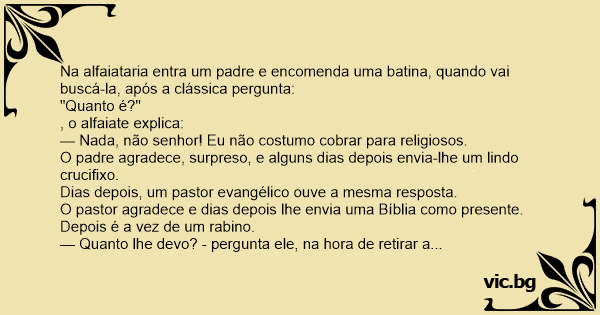 Na alfaiataria entra um padre e encomenda uma batina, quando vai buscá-la, após a clássica pergunta: