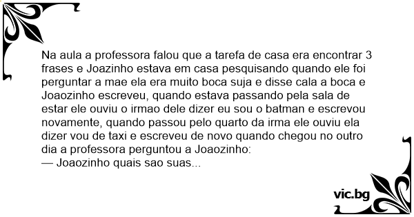 Na aula a professora falou que a tarefa de casa era encontrar 3 frases e Joazinho estava em casa pesquisando quando ele foi perguntar a mae ela era muito boca suja e disse cala a boca e Joaozinho escreveu, quando estava passando pela sala de estar ele ouviu o irmao dele dizer eu sou o batman e escrevou novamente, quando passou pelo quarto da irma ele ouviu ela dizer vou de taxi e escreveu de novo quando chegou no outro dia a professora perguntou a Joaozinho:
