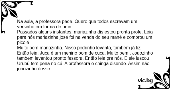 Urubú tem pena no cú. A professora o chinga disendo. Assim não joaozinho desse jeito não fiса bem. Ele imediatamente refez o texto e falou pronto fessora. Então leia. E o joão urubú tem pena no pé, não tem no cú porque a professora não qué.