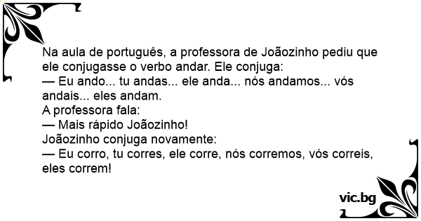 Na aula de português, a professora de Joãozinho pediu que ele conjugasse o verbo andar. Ele conjuga:
