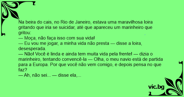 Na beira do cais, no Rio de Janeiro, estava uma maravilhosa loira gritando que iria se suicidar, até que apareceu um marinheiro que gritou:
