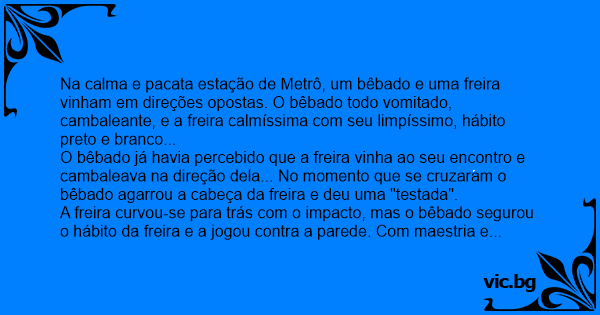 O bêbado já havia percebido que a freira vinha ao seu encontro e cambaleava na direção dela... No momento que se cruzaram o bêbado agarrou a cabeça da freira e deu uma "testada".