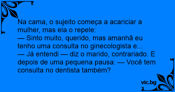 На забар Squeaky Clean Doctor's Appointment Tomorrow Chiste del ginecólogo y el dentista Zahnarzt-Termin Ραντεβού στον γυναικολόγο Ραντεβού με τον οδοντίατρο Една вечер след като семейна двойка си легнали, мъжът нежно потупал съпругата си по рамото. Тя: Ночь. Мужу не спится, хочется, и он теребит жену. Она отвечает: One night, a couple is in the bed and the husband smoothly caresses their wife's arm... the wife is turned and she tells him: Un couple vient de se coucher. L'homme dit à sa femme : - Скъпи, гинекологът ми каза, две седмици никакъв секс! Ένα βράδυ ένα ζευγάρι έχει πέσει για ύπνο. Ο άνδρας αρχίζει να χαϊδεύει τη γυναίκα του απαλά. Αυτή γυρίζει και του λέει : A lady tells her husband, “My gynecologist said I can’t have sex for two weeks.” He replies, “What did your dentist say?” Un soir, alors qu’un couple se couche, le mari commence à caresser le bras de sa femme. Elle se retourne et lui dis: "Je suis désolé chéri, j’ai un rendez-vous chez le gynécologue demain et je veux rester ‘fraîche’." Le mari déçu se retourne. Quelques minutes plus tard, il se tourne de nouveau... Una pareja se acuesta en la cama, y el marido empieza a tocar a su esposa. La mujer se resiste y dice: - Lo siento amor, pero mañana temprano tengo cita con el ginecólogo y quiero estar fresca. Entonces el esposo le contesta: - Ok, pero con el dentista no tienes cita? Чоловік каже до жінки: — Люба, займімось любов’ю? Жінка: — Мені не можна, завтра до гінеколога йти! Чоловік образився, відвернувся до стінки. За декотрий час повертається й питає: — А до стоматолога тобі не треба? C'est un couple qui vient de se coucher. Le type a vraiment envie de faire l'amour. Mais sa compagne réplique qu'elle a un rendez-vous chez le gynécologue et elle veut rester fraîche. Un peu plus... Mitt i natten vaknar mannen, kryper ner till hustrun och gör några försiktiga närmanden. - Nej, det går inte, säger frun bestämt. Imorgon ska jag till gynekologen. Mannen tänker efter, kryper... Eheleute liegen im Bett und er hat Lust auf Sex. Seine Frau lehnt ab, weil sie am nächsten Tag einen Gynäkologentermin hat und deshalb möchte sie jetzt nicht. Er dreht sich zur Seite und versucht... Mann og kone ligger i senga en kveld når mannen prikker kona på skulderen og beginner å klappe armen hennes. Kona snur seg og sier «Beklager kjære. Jeg skal til gynekologen i morgen og vil være ren... Ein Ehepaar ist zu Bett gegangen und nach einer Weile deutet er an, dass er Sex haben will. Sie lehnt ab: "Ich habe morgen einen Termin beim Gynäkologen und deshalb mag ich jetzt nicht." Er dreht... Emiel ligt al de halve nacht te woelen. Op een gegeven moment maakt hij zijn vrouw wakker en zegt: "Schatje, ik heb zo'n zin om met je te vrijen?" Zijn vrouw zegt: "Uhhh .... nee liefje, dat kan... Wife comes back from the doctor and says to her husband: Honey, I have a sad news - a gynecologist told me not have sex for a three weeks... Husband: And what the dentist said? „Schatz, mein Frauenarzt sagt wir können erstmal keinen Sex haben.“ …„und was sagt dein Zahnarzt?“ Para nowożeńców leży w łóżku wieczorem, kiedy facet nabrał ochoty na seks, pochyla się w stronę żony i puka ją lekko w ramię. Ona odwraca się do niego i mówi: - Nie możemy się dzisiaj kochać, rano... Na, Schatz, wie wär’s… wollen wir heute Abend mal wieder…? - Bitte heute nicht, Du weißt doch, dass ich morgen einen Termin beim Frauenarzt habe! - Na ja, aber Du hast doch nicht auch noch einen... Un uomo si sveglia eccitatissimo nel mezzo della notte. Sveglia la moglie e le propone una sveltina. Ma la moglie risponde: - 'Domani ho un appuntamento con il ginecologo. Sai che non voglio farlo... Eräänä iltana pariskunta makaa sängyllä ja aviomies taputtaa vaimoa olkapäälle ja alkaa hieromaan vaimon käsivartta. Vaimo kääntyy ja sanoo: - Sori kulta, tapaan huomenna gynekologin ja haluan... Det är natt, och mannen kryper närmare hustrun. - Det går inte, jag ska till gynekologen imorgon, säger frun. Han drar tillbaka handen. Men efter en liten stund frågar mannen hoppfullt. - Men du... Killen låg i sängen och trevade efter tjejen, i hopp om att få något. - Nej, inte ikväll sa tjejen. Jag ska till gynekologen imorgon bitti och vill vara någorlunda fräsch. Sedan blev det tyst,... Barbatul:Nevasta, nu ai chef de sex? Nevasta:Nu pot ca maine merg la ginecolog, B: (dupa 5 minute)Da la dentist te duci?? - Min gynekolog sa att jag inte kan ha sex på två veckor. - Jaha, men din tandläkare har väl inte avrådit från sex…