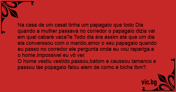Na casa de um casal tinha um papagaio que todo Dia quando a mulher passava no corredor o papagaio dizia vai em qual cabaré vаса?e Todo dia éra assim até que um dia ela converssou com o marido,amor o seu papagaio quando eu passo no corredor ele pergunta onde eu vou rapariga,e o home,impossivel eu vô ver.