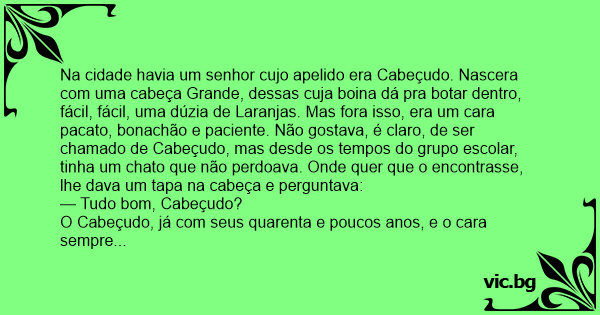 Na cidade havia um senhor cujo apelido era Cabeçudo. Nascera com uma cabeça Grande, dessas cuja boina dá pra botar dentro, fácil, fácil, uma dúzia de Laranjas. Mas fora isso, era um cara pacato, bonachão e paciente. Não gostava, é claro, de ser chamado de Cabeçudo, mas desde os tempos do grupo escolar, tinha um chato que não perdoava. Onde quer que o encontrasse, lhe dava um tapa na cabeça e perguntava: