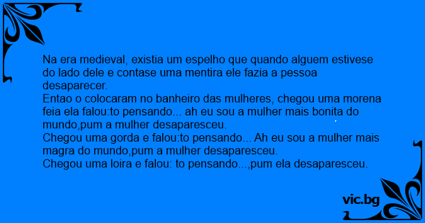 Entao o colocaram no banheiro das mulheres, chegou uma morena feia ela falou:to pensando... ah eu sou a mulher mais bonita do mundo,pum a mulher desaparesceu.