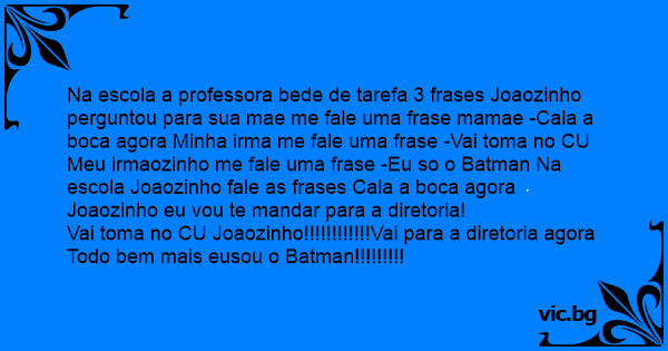 Na escola a professora bede de tarefa 3 frases Joaozinho perguntou para sua mae me fale uma frase mamae -Cala a boca agora Minha irma me fale uma frase -Vai toma no CU Meu irmaozinho me fale uma frase -Eu so o Batman Na escola Joaozinho fale as frases Cala a boca agora Joaozinho eu vou te mandar para a diretoria!