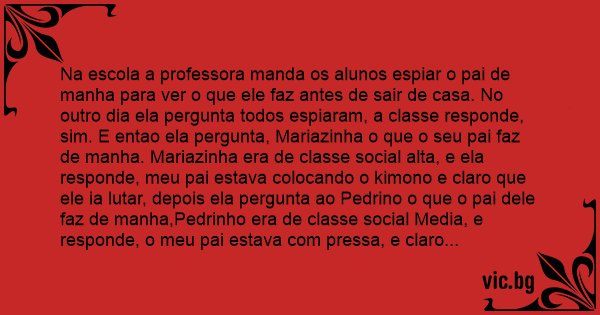Na escola a professora manda os alunos espiar o pai de manha para ver o que ele faz antes de sair de casa. No outro dia ela pergunta todos espiaram, a classe responde, sim. E entao ela pergunta, Mariazinha o que o seu pai faz de manha. Mariazinha era de classe social alta, e ela responde, meu pai estava colocando o kimono e claro que ele ia lutar, depois ela pergunta ao Pedrino o que o pai dele faz de manha,Pedrinho era de classe social Media, e responde, o meu pai estava com pressa, e claro que ele ia trabalhar, e entao ela pergunta ao Joaozinho, que era de classe Baixa, Joaozinho o que o seu pai faz de manha, o meu pai estava com o jornal na mao, e claro que ele ia саgаr.