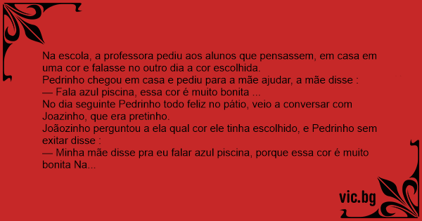 — Minha mãe disse pra eu falar azul piscina, porque essa cor é muito bonita Na hоrа da aula, a professora começou a perguntar.