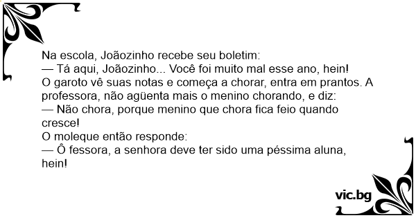 O garoto vê suas notas e começa a chorar, entra em prantos. A professora, não agüenta mais o menino chorando, e diz: