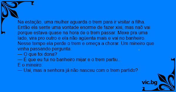 Na estação, uma mulher aguarda o trem para ir visitar a filha. Então ela sente uma vontade enorme de fazer xixi, mas naõ vai porque estava quase na hоrа de o trem passar. Mexe pra uma lado, vira pro outro e ela não agüenta mais e vai no banheiro. Nesse tempo ela perde o trem e omeça a chorar. Um mineiro que vinha passando pergunta: