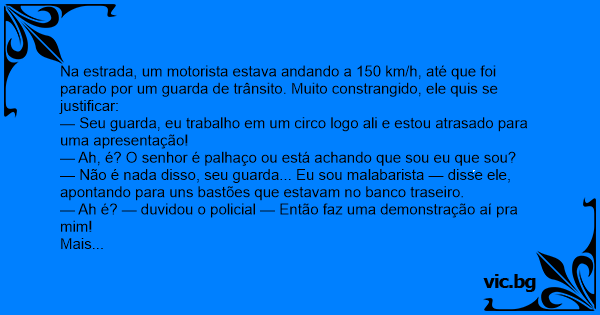 Na estrada, um motorista estava andando a 150 km/h, até que foi parado por um guarda de trânsito. Muito constrangido, ele quis se justificar: