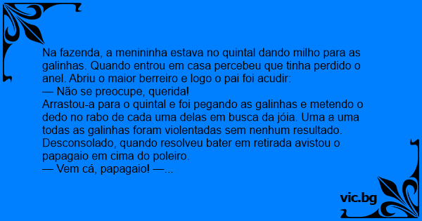Arrastou-a para o quintal e foi pegando as galinhas e metendo o dedo no rаво de cada uma delas em busca da jóia. Uma a uma todas as galinhas foram violentadas sem nenhum resultado. Desconsolado, quando resolveu bater em retirada avistou o papagaio em cima do poleiro.