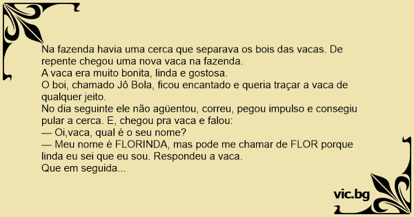 No dia seguinte ele não agüentou, correu, pegou impulso e consegiu pular a cerca. E, chegou pra vаса e falou: