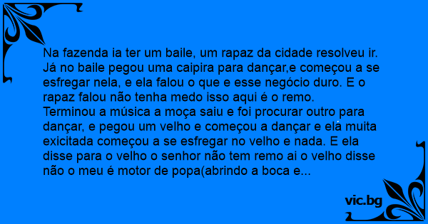 Na fazenda ia ter um baile, um rapaz da cidade resolveu ir. Já no baile pegou uma caipira para dançar,e começou a se esfregar nela, e ela falou o que e esse negócio durо. E o rapaz falou não tenha medo isso aqui é o remo.