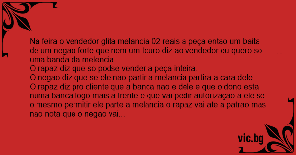 Na feira o vendedor glita melancia 02 reais a peça entao um baita de um negao forte que nem um touro diz ao vendedor eu quero so uma banda da melencia.