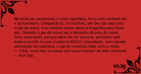 Na festa de casamento o noivo apertado, ficou com vontade de ir ao banheiro. Chegando lá, no mictório, ele deu de cara com o pai da noiva, mas mesmo assim abriu a braguilha para fazer xixi. Quando o pai da noiva viu o tamanho do раu do noivo, ficou espantado, porque além de ser enorme, percebeu que estava escrito no раu a palavra BUCO. Assustado, com aquela aberração da natureza, o pai foi correndo falar com a noiva: