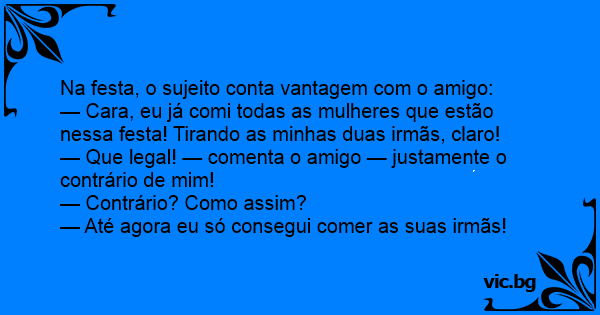 — Cara, eu já comi todas as mulheres que estão nessa festa! Tirando as minhas duas irmãs, claro!