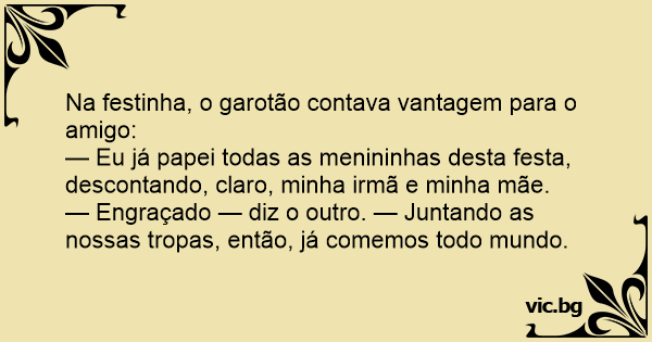— Eu já papei todas as menininhas desta festa, descontando, claro, minha irmã e minha mãe.
