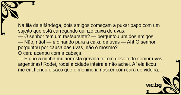 Na fila da alfândega, dois amigos começam a puxar papo com um sujeito que está carregando quinze caixa de uvas.