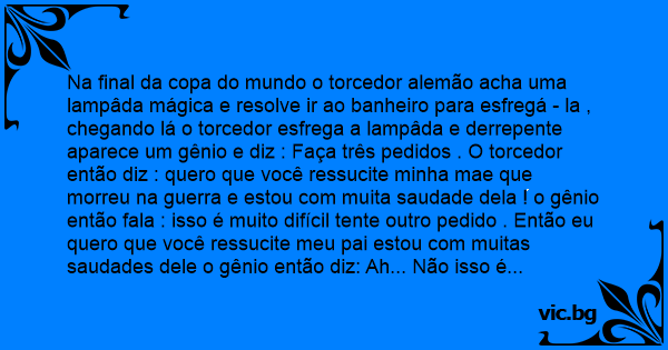 Na final da copa do mundo o torcedor alemão acha uma lampâda mágica e resolve ir ao banheiro para esfregá - la , chegando lá o torcedor esfrega a lampâda e derrepente aparece um gênio e diz : Faça três pedidos . O torcedor então diz : quero que você ressucite minha mae que morreu na guerra e estou com muita saudade dela ! o gênio então fala : isso é muito difícil tente outro pedido . Então eu quero que você ressucite meu pai estou com muitas saudades dele o gênio então diz: Ah... Não isso é muito difícil , tente outro pedido :Então eu quero que a Alemanha ganhe do Brasil na copa . O gênio então diz : Qual era o nome dos seus pais mesmo ?