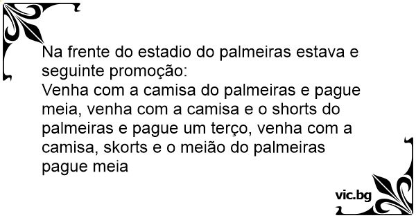 Venha com a camisa do palmeiras e pague meia, venha com a camisa e o shorts do palmeiras e pague um terço, venha com a camisa, skorts e o meião do palmeiras pague meia