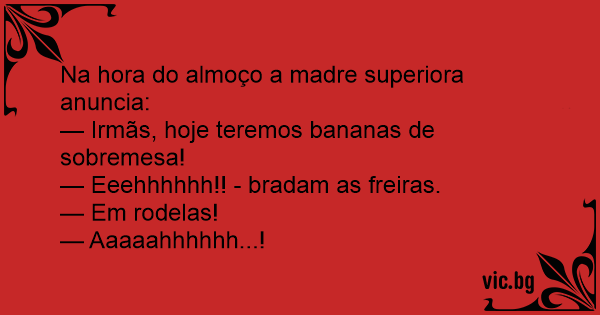 Na hоrа do almoço a madre superiora anuncia:<br />— Irmãs, hoje teremos bananas de sobremesa!<br />— Eeehhhhhh!! - bradam as freiras.<br />— Em rodelas!<br />— Aaaaahhhhhh...!