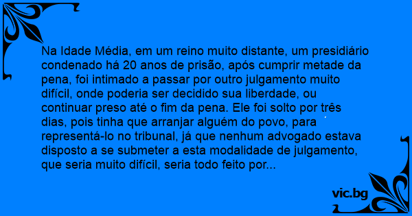 Na Idade Média, em um reino muito distante, um presidiário condenado há 20 anos de prisão, após cumprir metade da pena, foi intimado a passar por outro julgamento muito difícil, onde poderia ser decidido sua liberdade, ou continuar preso até o fim da pena. Ele foi solto por três dias, pois tinha que arranjar alguém do povo, para representá-lo no tribunal, já que nenhum advogado estava disposto a se submeter a esta modalidade de julgamento, que seria muito difícil, seria todo feito por mímicas. Então o presidiário, saiu pela cidade procurando um representante, mas ninguém quis aceitar, todos tinham medo dos sacerdotes e juízes do rei.