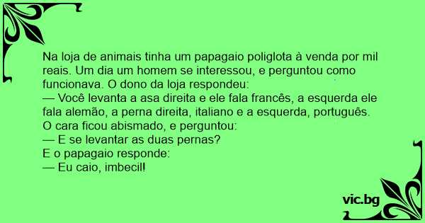 Ξενόγλωσσος Παπαγάλος The singing parrot Един човек си купил папагал, закачил му един червен и един син конец и му казал: Един мъж си купил папагал и му вързал два конеца: Nel giardino di un convento due suore trovano un pappagallo ferito e decidono di prendersene cura, dandogli affetto e correggendo il suo vocabolario, pieno di parole volgari. A parrot was in a pet shop with a string attached to each leg when a man walked in looking to buy a pet. A shopkeeper came over and started to try and sell him a dog when the man noticed the parrot. He asked what the strings were for and the shopkeeper replied, "Well, if you pull the right... Man decides to buy a pet, but does not know what he wants as a pet, so he goes to the pet shop in search of a pet. He sees cats in a cage dogs on another cage spiders, rabbits, frogs, birds, fish in aquariums and finally he sees a very colorful parrot in the corner of the store and he goes to... In einer Tierhandlung. Der Kunde kann sich nicht entschließen. "Aber hier habe ich etwas Besonderes", sagt der Verkäufer, "einen besonders gut erzogenen Papagei. An jedem Bein hat er ein Kettchen. Wenn man am linken zieht, sagt er 'Guten Morgen', wenn man am rechten zieht, 'Angenehme Nachtruhe'."... Un type achète un perroquet. Le vendeur lui dit : Il est bilingue (français/anglais). Ah oui ? Et comment on choisit la langue ? Très simple : il a un fil à chaque patte. Vous tirez sur le fil de gauche, il parle en francais. Vous tirez sur le fil de droite, il parle en anglais. Et si je tire sur... Eine Frau geht ins Zoogeschäft und möchte einen besonderen Papagei. Zoohändler: "Dann nehmen Sie den hier, der mit den zwei Schnüren die an seinen Beinen hängen." Frau: "Was passiert, wenn man da... Llega una señora a una tienda de mascotas y le pregunta al vendedor: Señor, estoy en un dilema, ¿Qué mascota me recomienda comprar? El señor contesta: Le recomiendo comprar un loro, para que tenga... C'est une blonde qui va dans une animalerie et qui demande: -Combien coûte cette boule de poils ? Le marchand répond: -200 euros -200 euros pour une vulgaire boule de poils, s'exclame la... Ekspeditøren i dyrebutikken: - Dette er en meget flott papegøye frue. Fruen: - Kan den snakke? Ekspeditøren: - Ja, når du drar den i det venstre benet sier den "God dag" og når du drar den i det... Um cara chamou um amigo para ver seu papagaio: -olha samuel,meu papagaio sabe falar em um monte de linguas,por exemplo,se vc levanta a perna direita ele fala em Ingles e se vc levantar a perna... Llega un plomero a un convento a realizar un trabajo de fontanería, se entera éste de que la madre superiora tiene un perico. El fontanero muy aficionado a los pericos le pregunta a la madre... padre onorio foi a feira comprar um papagaio, mas como era muito precavido foi logo perguntando se ele falava palavrao: -nao fala nao seu padre...ele foi criado pela minha santa maezinha. olhando... Een vrome vrouw is heel trots op haar papegaai en kan het niet laten om er in de kerk mee te pronken. Ze zegt tegen de pastoor: "Als je aan zijn rechterpoot trekt, zegt hij het Lievevrouwengebed op... Um elemento esta vendendo um papagaio no centro da cidade, quando passa um sujeito e pergunta o preco, olha daqui, dali, e pergunta, mas porque esse papagaio tem uma fitinha em cada perna? O... Eine Frau geht in den Tierladen und will sich einen Papagei kaufen. Auf einmal sieht sie das der eine Papagei zwei Schnüre an den Beinen hat. Frau: Wieso hat der Papagei zwei Scnüre an den Füßen?... Bir gün birisi papağanını satmak istiyormuş. Bunun için onu bir satıcıya götürmüş. Papağanı oradaki kafeslerden birine koyup satılmasını bekliyormuş. Bir ara bir müşteri gelmiş ve papağanın... Uma senhora entrou em uma avicultura e viu um papagaio com uma correntinha em cada pé. Muito curiosa, chamou o balconista e foi logo perguntando: — Ei, moço qual a função das duas correntinhas do... Magda gaat elke week naar de kerk. Op een dag komt ze met haar papegaai op bezoek bij meneer pastoor en zegt: “Kijk eens wat ik mijn papegaai heb geleerd! Als je aan zijn rechterpoot trekt, zegt... Egy nő bemegy az állatkereskedésbe. Meglát egy 38000 Ft-os papagájt, aminek egyik lábán piros, a másik lábán kék szalag van. A nő megkérdezi az eladót: - Tessék mondani, miért ilyen drága ez a... Un om intra la un pet shop si vede intr-o colivie un papagal legat cu doua sfori. Il intreaba pe vanzator: - Nu va suparati, de ce ale papagalu-asta doua sfori legate de el? - Pai uite, daca tragi... Estava o vendedor mostrando as qualidades do papagaio à cliente: — Se levanto a asa direita, ele fala em inglês: Levantou a asa direita e o papagaio perguntou: — Do you like me? Levantou a esquerda... En la tienda de mascotas, un tipo está mirando a los animales en venta. De pronto, un loro le llama mucho la atención, pero se asombra cuando ve el precio: 5 mil dólares. Intrigado se dirige al... O dono do papagaio disse para seu amigo com muito orgunho de seu papagaio se ele levantar a perna direita ele fala Inglês. Se levantar a perna esquerda ele fala Espanhol o seu amigo fala _ E ele... Der var en gang en mand der ville have en papegøje, men den skulle osse kunne snakke. Derfor gik han ned til dyrehandleren og sgade at han skulle have en papegøje der kunne snakke. - Nåh, sagde... C'est une blonde à l'animalerie qio va voir les perroquets. Le monsieur qui conseille lui dit : - Si vous lui tirez sur la patte droite il dira bonjour. Si vous lui tirez sur la patte gauche il... Un tip se duce sa-si cumpere un papagal de la un magazin. Intra el,se uita si vede un papagal frumos care avea legat de fiecare picior cate o sforicica. Mirat il intreaba pe vanzator de ce are... Juquinha foi a loja de papagaios e o vendedor veio logo correndo e gritando - Juquinhaaa !!! Aqui te