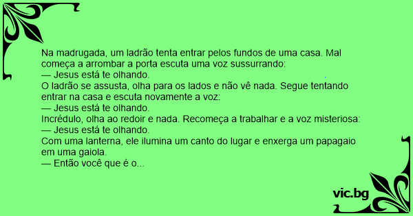Jesus sieht dich auch komischer Name Η απόκοσμη φωνή Ο συναγερμός Ωραία ονόματα Πρόσεχε... Ο Θεός σε βλέπει! Ο Ιησούς Крадец влязал в къща да краде. Там имало папагал крадецът почнал да рови и папагалат казал: Вор залезает в дом, а там - попугай. Ein Einbrecher steigt in ein leeres Haus ein. Im ersten Stock hört er auf einmal eine Stimme: Late one night, a burglar broke into a house that he thought was empty. A man was robbing a house in the middle of the night. All of a sudden, he heard a parrot cry out. "Jesus is gonna get you." The robber ignored it, and takes the TV. Again, the parrot cries out. "Jesus is gonna get you." The robber started to get a little worried. "What's your name, birdie?"... Un voleur s'introduit un soir dans une maison et pendant qu'il est en train de cambrioler tout ce qu'il peut il entend une petite voix derrière lui qui lui dis: -Prends garde Jésus te voit ! Il se retourne mais ne remarque rien. Puis une deuxième fois la voix l'interpelle: - Attention. Jésus te... Un ladrón entra a robar en una casa y de pronto, escucha una voz que dice: Jesús te esta mirando el ladra se detiene.luego como no hollé nada continua.y de nuevo la vos dice: Jesús te esta mirando,el ladro asustado prende la luz y ve que esa vos viene de un loro que estaba en una jaula,y el... Un ladro entra in un appartamento buio, ma fatti due passi sente una voce: "Attento! Gesu' ti vede e ti sta giudicando!". Terrorizzato resta immobile, ma dopo pochi secondi la voce continua: "Attento! Gesu' ti ha visto, ti ha giudicato ed ora ti punira' ". A quel punto il ladro accende la torcia... C'est l'histoire d'un type qui va cambrioler un appartement. Il est là avec sa lampe de poche en train de fouiller dans les tiroirs, lorsque tout à coup il entend un voix derrière lui: - "Jésus et Marie te regardent !" Surpris, le cambrioleur se retourne, et de nouveau la voix: - "Jésus et Marie... C'est un type qui se promène dans la rue, et accroché sur la porte d'une entrée d'un jardin, il voit : ATTENTION PERROQUET MéCHANT ! Et un peux plus loin dans le jardin, il aperçoit notre bête,... En inbrottstjuv hade bevakat en villa under en längre tid. En mörk kväll var han säker på att ägarna var borta och skred till verket. Väl inne i huset hör han en hes röst: - Jag ser dig allt,... Inbrottstjuven smög in i den mörka villan. Plötsligt hördes en röst: - Jag ser dig och det gör Jesus också! Tjuven tvärstannade, tog ett nytt försiktigt steg fram och igen hördes, - Jag ser dig... Ein Einbrecher steigt durch das Fenster in ein Haus als er eine Stimme hört: "Jesus sieht dich." Verwirrt blickt er sich um, sieht aber niemanden. Er beginnt wertvolle Gegenstände an sich zu... Een zekere nacht probeert een inbreker in een huis te breken en hoort opeens een stem die zegt: "Jezus ziet wat je doet." De inbreker springt op, kijkt rond en ziet niets. Hij gaat dus verder met... Een inbreker sluipt door een donkere huiskamer, op zoek naar buit. Plotseling hoort hij een stem "Jezus houdt u in de gaten". De inbreker schrikt zich een ongeluk en verstopt zich achter een... Hırsız, gecenin yarısında bir eve girer. Karanlık koridorda, yaktığı küçük el fenerinin ışığında ilerlerken bir ses duyar: - "İsa seni izliyor!" Şaşkınlık ve korkuyla etrafına bakınan hırsız,... O ladrão ia assaltar uma casa, quando viu na porta um cartaz: Cuidado com o papagaio! Ele entrou e viu o raio do papagaio. Chegou perto e disse: — É com isso aí que eu tenho que tomar cuidado? Já... Late one night a burglar broke into a house and while he was sneaking around he heard a voice say, "Jesús is watching you." He looked around and saw nothing. He kept on creeping and again heard,... O ladrão avança em silêncio pela casa. — Jesus está vendo você — diz uma voz. O ladrão se detém, apavorado. Olha ao redor, em desespero. Num canto escuro, vê uma gaiola com um papagaio dentro e... A burglar broke into a house one night. He shone his torch around, looking for valuables when a voice in the dark said, ‘Jesus knows you’re here.’ He nearly jumped out of his skin, clicked his... Ao adentrar em uma residência alheia o ladão escuta uma voz: "Jesus tá te olhando". O ladrão todo assustado continua o seu trabalho quando a voz fala de novo: "Jesus tá te olhando". Aparvorado o... A burglar crept into a huge, luxurious house one night. Shining his flashlight on the floor in the dark, he heard a voice saying, "Jesus is watching you." He looked around nervously, shook his... O ladrão vai roubar uma casa. Quando está desconectando o computador, ouve uma voz que falava assim: -Jesus está te olhando. Ele não ligou e cuntinuou roubando, quando ouviu a mezma voz dizendo... Det var en gång en tjuv som gjorde inbrott i en lyvilla, just som han hörde en röst: - Jesus ser dig! Då tittade tjuven sig om och såg en papegoja. - Jaså du kan prata? sa tjuven. Vad heter du,... Um ladrão entrou na casa de madrugada para obviamente para assaltar. Enquanto colocava as coisas dentro de um saco , uma voz falou: "Jesus está te olhando." O ladrão assustado olha para um lado,... Złodziej idzie obrabować mieszkanie. Nagle słyszy: - Jezus patrzy, Jezus patrzy. Idzie dalej i znowu słyszy: - Jezus patrzy, Jezus patrzy. Odwraca się i widzi papugę, która mówi: - Jezus patrzy.... Um ladrão pulou numa casa p roubar. Quando estava dentro de casa,escutou: -Jesus ta te vendo... Continuou.Depois escutou de novo: -Jesus tá te olhando... Aí o ladrão para e olha para o lado,e... Um ladrão, pulou o muro de uma casa e foi até a porta na intensão de arromba-lá, quando estava quase conseguindo,uma voz estranha o adverte: -Cuidado jesus esta vendo !!! Assustado ele olha para... Dois ladrões resolvem invadir uma casa e arrombam a porta de entrada. T