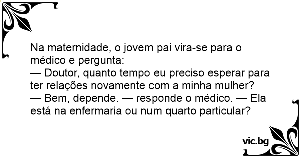 — Doutor, quanto tempo eu preciso esperar para ter relações novamente com a minha mulher?