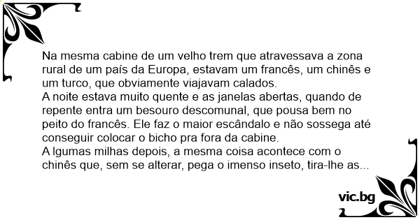 Na mesma cabine de um velho trem que atravessava a zona rural de um país da Europa, estavam um francês, um chinês e um turco, que obviamente viajavam calados.