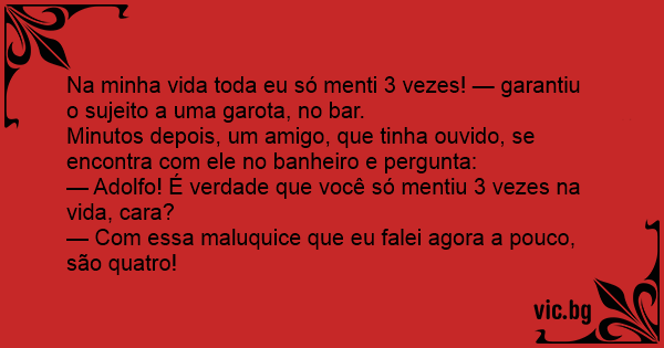 Na minha vida toda eu só menti 3 vezes! — garantiu o sujeito a uma garota, no bar.
