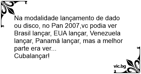 Na modalidade lançamento de dado ou disco, no Pan 2007,vc podia ver Brasil lançar, EUA lançar, Venezuela lançar, Panamá lançar, mas a melhor parte era ver...