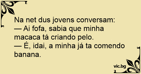 Duas adolescentes conversando: — Flavinha, a minha macaquinha já está ficando toda cabeluda! — Bobinha! A minha já está comendo banana!!