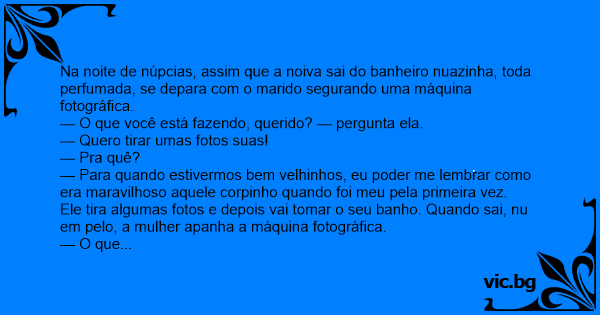 Na noite de núpcias, assim que a noiva sai do banheiro nuazinha, toda perfumada, se depara com o marido segurando uma máquina fotográfica.