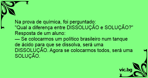 — Se colocarmos um político brasileiro num tanque de ácido para que se dissolva, será uma DISSOLUÇÃO. Agora se colocarmos todos, será uma SOLUÇÃO.