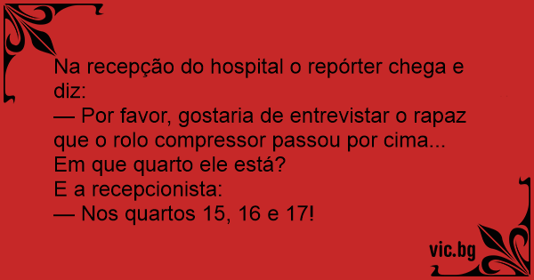 — Por favor, gostaria de entrevistar o rapaz que o rolo compressor passou por cima... Em que quarto ele está?