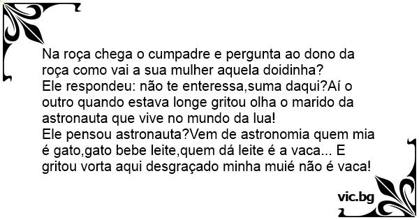 Na roça chega o cumpadre e pergunta ao dono da roça como vai a sua mulher aquela doidinha?