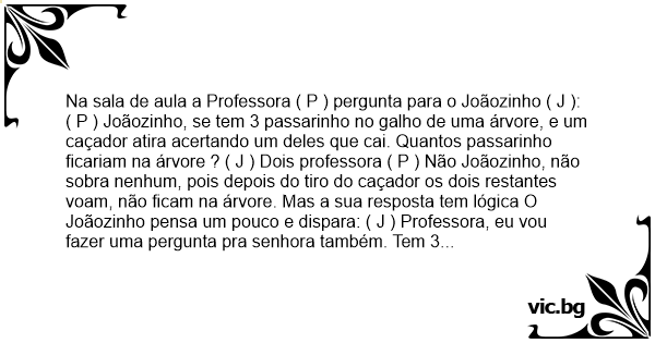 ( P ) Joãozinho, se tem 3 passarinho no galho de uma árvore, e um caçador atira acertando um deles que cai. Quantos passarinho ficariam na árvore ? ( J ) Dois professora ( P ) Não Joãozinho, não sobra nenhum, pois depois do tiro do caçador os dois restantes voam, não ficam na árvore. Mas a sua resposta tem lógica O Joãozinho pensa um pouco e dispara: ( J ) Professora, eu vou fazer uma pergunta pra senhora também. Tem 3 mulheres com um sorvete na mão de cada uma, uma esta chupando o sorvete, a outra lambendo e a última mordendo. Qual das 3 mulheres é casada ? ( P ) A que está mordendo. ( J ) Não professora, a casada é aquela que está de aliança. Mas a resposta da senhora tem lógica