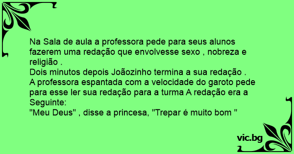 Na Sala de aula a professora pede para seus alunos fazerem uma redação que envolvesse sеxо , nobreza e religião .