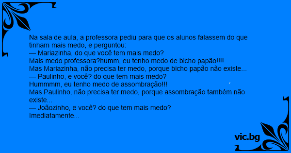 Na sala de aula, a professora pediu para que os alunos falassem do que tinham mais medo, e perguntou: